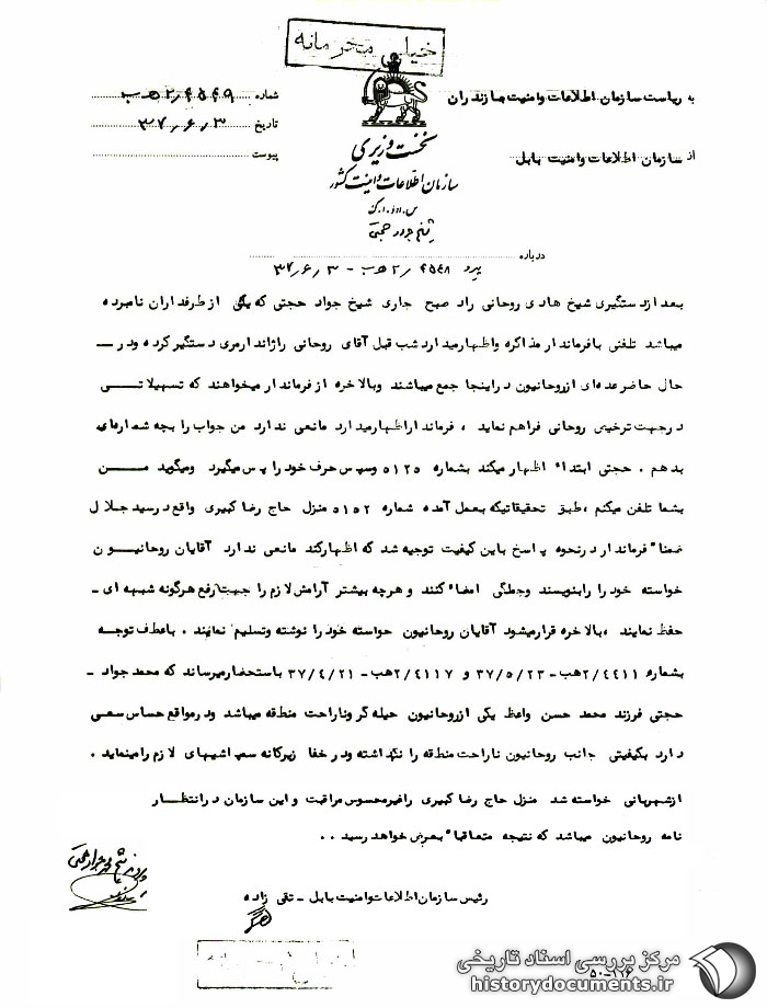بعد از دستگیری شیخ هادی روحانیراد صبح جاری شیخ جواد حجتی که یکی از طرفداران نامبرده میباشد تلفنی با فرماندار مذاکره و اظهار میدارد شب قبل آقای روحانی را ژاندارمری دستگیر کرده و در حال حاضر عدهای از روحانیون در اینجا جمع میباشند و بالاخره از فرماندار میخواهند که تسهیلاتی در جهت ترخیص روحانی فراهم نماید، فرماندار اظهار میدارد مانعی ندارد. من جواب را به چه شمارهای بدهم. حجتی ابتداء اظهار میکند به شماره 5125 [5152] و سپس حرف خود را پس میگیرد و میگوید من به شما تلفن میکنم، طبق تحقیقاتی که به عمل آمده شماره 5152 منزل حاج رضا کبیری واقع در سیدجلال [است]. ضمناً فرماندار در نحوهی پاسخ به این کیفیت توجیه شد که اظهار کند مانعی ندارد، آقایان روحانیون خواسته خود را بنویسند و جملگی امضاء کنند و هرچه بیشتر آرامش لازم را جهت رفع هرگونه شبههای حفظ نمایند، بالاخره قرار میشود آقایان روحانیون خواسته خود را نوشته و تسلیم نمایند. با عطف توجه به شماره 4411/ 2ﻫ ب – 23 /5 / 37 و 4117 / 2ﻫ ب – 21 /4 /37 به استحضار میرساند که محمدجواد حجتی، فرزند محمدحسن واعظ یکی از روحانیون حیلهگر و ناراحت منطقه میباشد و در مواقع حساس سعی دارد به کیفیتی جانب روحانیون ناراحت منطقه را نگهداشته و در خفا زیرکانه سمپاشیهای لازم را مینماید.