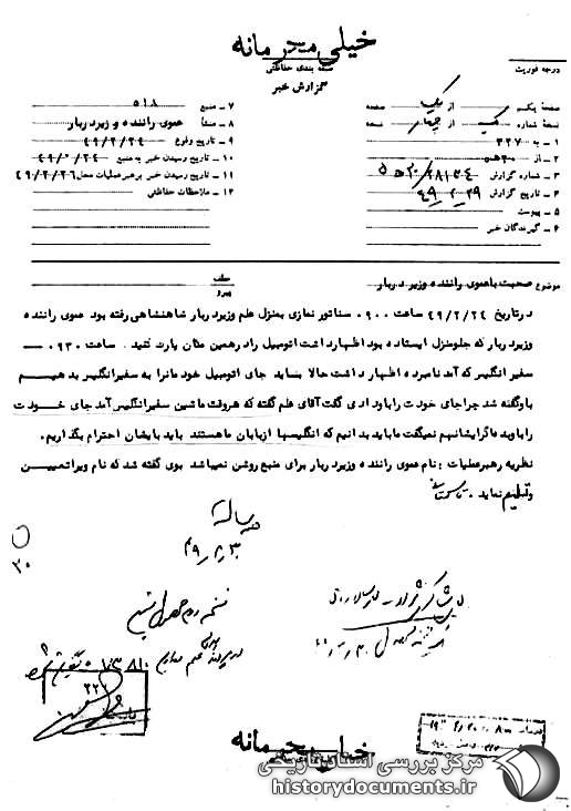 در تاریخ 24 /2 /49 ساعت 0900 سناتور نمازی به منزل علم وزیر دربار شاهنشاهی رفته بود؛ عموی راننده وزیر دربار که جلو منزل ایستاده بود، اظهار داشت: اتومبیل را در همین مکان پارک کنید. ساعت 0930 سفیر انگلیس که آمد، نامبرده اظهار داشت: حالا باید جای اتومبیل خودمان را به سفیر انگلیس بدهیم. به او گفته شد: چرا جای خودت را به او دادی؟ گفت: آقای علم گفته که هر وقت ماشین سفیر انگلیس آمد، جای خودت را به او بده؛ اگر ایشان هم نمیگفت، ما باید بدانیم که انگلیسها اربابان ما هستند؛ باید به ایشان احترام بگذاریم.