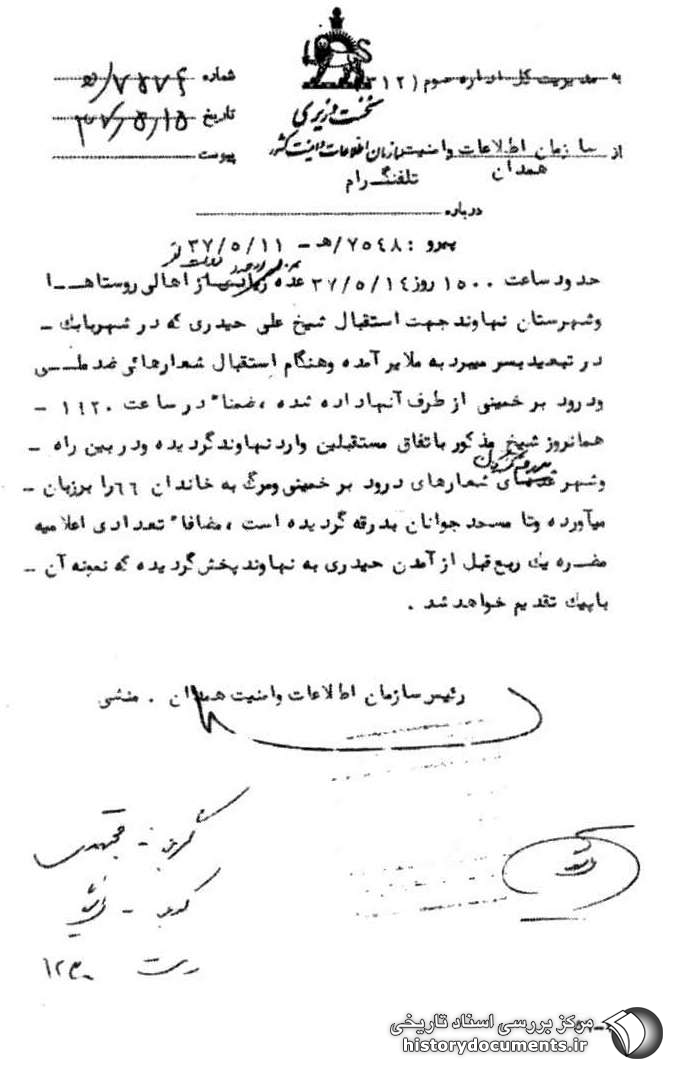 حدود ساعت 15 روز 14 /5 /37 عده زیادی از اهالی روستاها و شهرستان نهاوند جهت استقبال شیخ علی حیدری که در شهر بابک در تبعید به سر میبرد به ملایر آمده و هنگام استقبال شعارهایی ضد ملی و درود بر خمینی از طرف آنها داده شده، ضمناً در ساعت ۱۹:۲۰ همانروز شیخ مذکور به اتفاق مستقبلین وارد نهاوند گردید و در بین راه و شهر بدرقه کنندگان شعرهای درود بر خمینی و مرگ بر خاندان 66 را بر زبان میآورده تا مسجد جوانان بدرقه گردیده است. مضافاً تعدادی اعلامیه مضره یک ربع قبل از آمدن حیدری به نهاوند پخش گردیده که نمونه آن با یک پیک تقدیم خواهد شد.