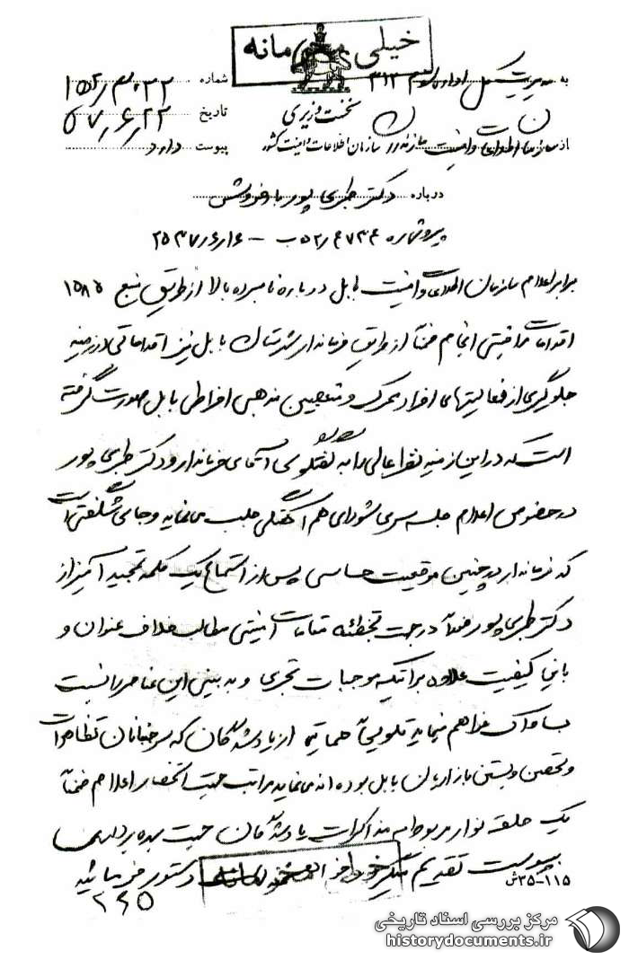 برابر اعلام سازمان اطلاعات و امنیت بابل درباره نامبرده بالا از طریق منبع 1585 اقدامات مراقبتی آنجام، ضمناً از طریق فرماندار شهرستان بابل نیز اقداماتی در زمینه جلوگیری از فعالیتهای افراد محرّک و متعصّبین مذهبی افراطی بابل صورت گرفته است که در این زمینه نظر عالی را به گفتگوی آقای فرماندار و طبریپور در خصوص اعلام جلسه سرّی شورای هماهنگی جلب مینماید و جای شگفتی است که فرماندار در چنین موقعیت حساسی پس از استماع یک کلمهی تمجیدآمیز از دکتر طبریپور فعلاً در جهت تخطئه مقامات امنیتی مطالب خلاف عنوان و به این کیفیت علاوه بر این که موجبات تجری و بدبینی این عناصر را نسبت به ساواک فراهم مینماید تلویحاً حمایتی از یادشدگان که سرجنبانان تظاهرات و تحصّن و بستن بازاریان بابل بودهاند مینماید. مراتب جهت استحضار اعلام، ضمناً یک حلقه نوار مربوط به مذاکرات یادشدگان جهت بهرهبرداری به پیوست تقدیم میگردد. خواهشمند است دستور فرمائید نوار ارسالی را پس از بهرهبرداری به این سازمان اعاده نمایند.