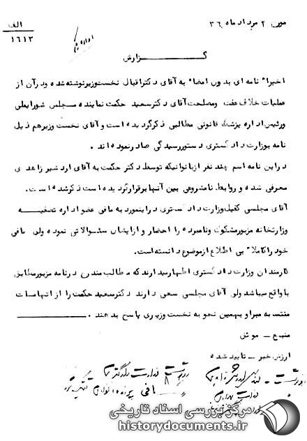 اخیراً نامهای بدون امضاء به آقای اقبال نخستوزیر نوشته شده و در آن از عملیات خلاف عفت و مصلحت آقای دکتر سعید حکمت نماینده مجلس شورای ملی و رئیس اداره پزشک قانونی مطالبی ذکر گردیده است و آقای نخستوزیر هم ذیل نامه به وزارت دادگستری دستور رسیدگی صادر نمودهاند.