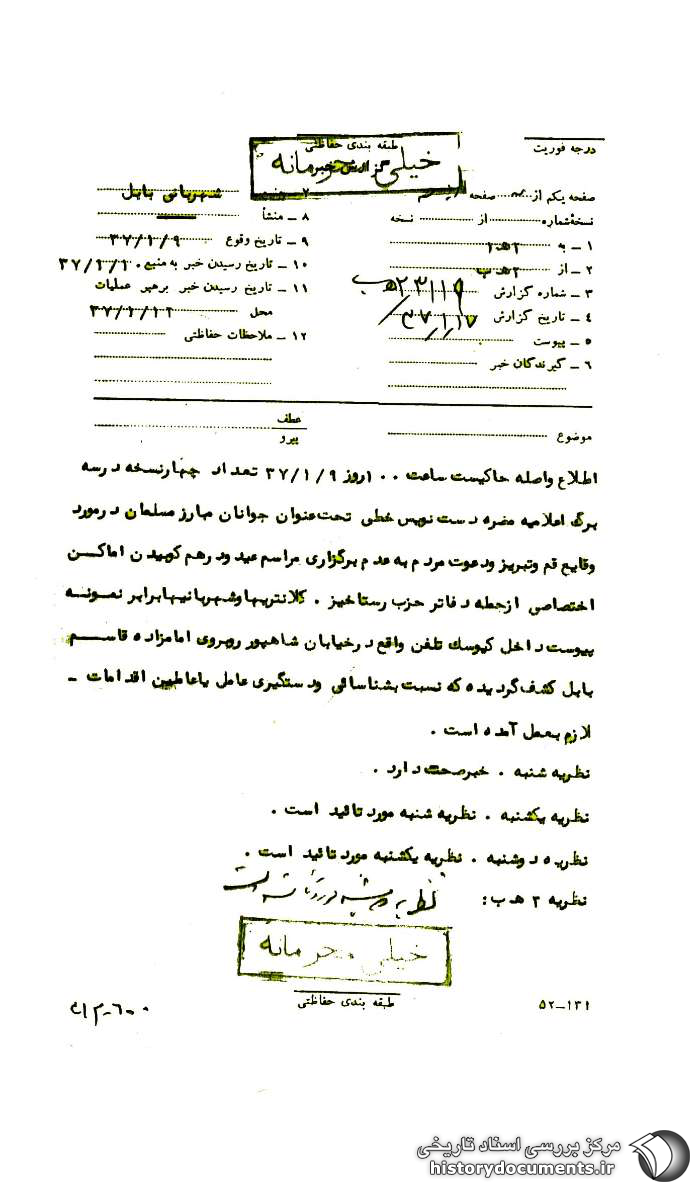 اطلاع واصله حاکی است ساعت 1000 روز 9 /1 /37 تعداد چهار نسخه در سه برگ اعلامیه مضرّه دستنویس خطّی تحت عنوان جوانان مبارز مسلمان در مورد وقایع قم و تبریز و دعوت مردم به عدم برگزاری مراسم عید و در هم کوبیدن اماکن اختصاصی ازجمله دفاتر حزب رستاخیز، کلانتریها و شهربانیها برابر نمونه پیوست1 داخل کیوسک تلفن واقع در خیابان شاهپور روبروی امامزاده قاسم بابل کشف گردیده که نسبت به شناسایی و دستگیری عامل یا عاملین اقدامات لازم به عمل آمده است.