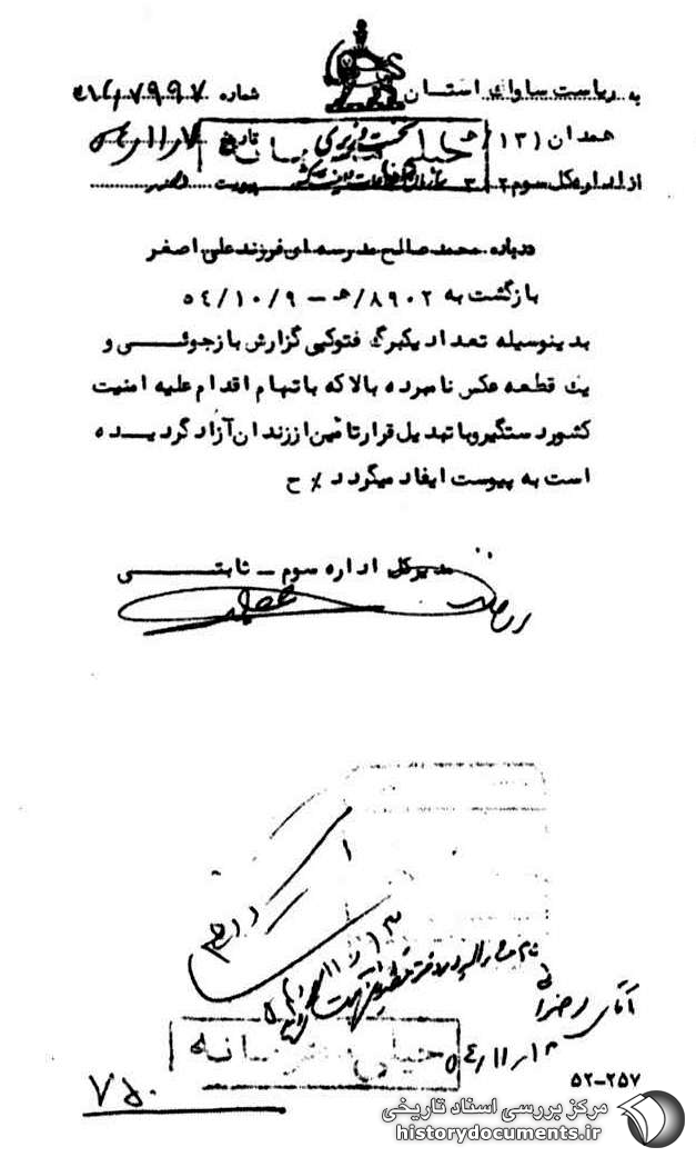 بدینوسیله تعداد یک برگ فتوکپی گزارش بازجوئی و یک قطعه عکس نامبرده بالا که به اتهام اقدام علیه امنیت کشور دستگیر و با تبدیل قرار تأمین از زندان آزاد گردیده است به پیوست ایفاد میگردد. ح