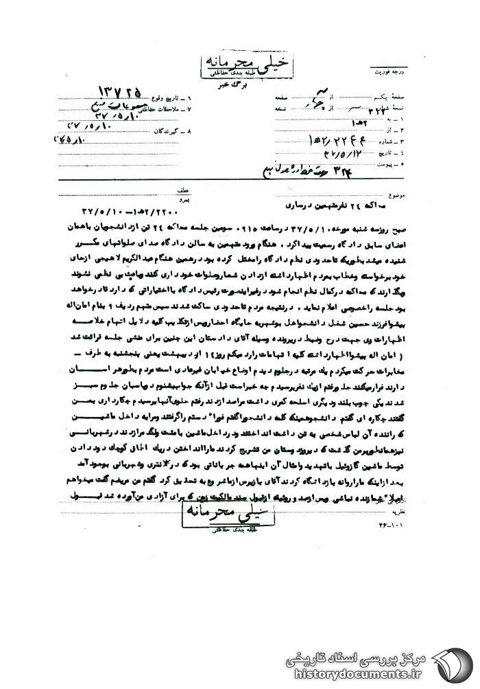 صبح روز سهشنبه مورخه 10 /5 /37 در ساعت 0915 سومین جلسه محاکمه 24 تن از دانشجویان با همان اعضای سابق دادگاه رسمیت پیدا کرد. هنگام ورود متهمین به سالن دادگاه صدای صلواتهای مکرر شنیده میشد بهطوریکه تا حدودی نظم دادگاه را مختل کرده بود در همین هنگام عبدالکریم لاهیجی از جای خود برخاسته1 و خطاب به مردم اظهار داشت از دادن شعار و صلوات خودداری کنند و باعث بینظمی نشوند و بگذارند که محاکمه در کمال نظم آنجام شود در غیر اینصورت رئیس دادگاه با اختیاراتی که دارد قادر خواهد بود جلسه را خصوصی اعلام نماید. در نتیجه مردم تا حدودی ساکت شدند سپس متهم ردیف 9 به نام امانالله پیشوا فرزند حسین شغل دانشجو اهل بوشهر به جایگاه احضار و پس از تکذیب کلیه دلایل اتهام خلاصه اظهارات وی جهت درج و ضبط در پرونده وسیله آقای دادستان این چنین برای منشی جلسه قرائت شد امانالله پیشوا اظهار داشت: «کلیه اتهامات را رد میکنم روز 14 اردیبهشت یعنی پنجشنبه به طرف مخابرات حرکت میکردم یک مرتبه در جلوم دیدم اوضاع خیابان غیرعادی است مردم بطور هراسان دارند فرار میکنند جلو رفتم از یک نفر پرسیدم چه خبر است قبل از آنکه جواب بشنوم دو پاسبان جلوم سبز شدند یکی چوب بلند و دیگری اسلحه کمری داشت مرا صدا زدند رفتم جلوی آنها پرسیدم چکار داری به من گفتند چکارهای گفتم دانشجو همینکه کلمه دانشجو را گفتم فوراً دستم را گرفتند و مرا به داخل ماشین که راننده آن لباس شخصی به تن داشت انداختند و در داخل ماشین با مشت و لگد مرا زدند در شهربانی نیز همانطور بر من گذشت که دیروز دوستان من تشریح کردند ما را انداختن در یک اطاق کوچک دود دادن توسط ماشین گازوئیل با تهدید و امثال آن اینها همه جریاناتی بود که در کلانتری و شهربانی بهوجود آمد بعد از اینکه ما را روانه بازداشتگاه کردند آقای بازپرس از ما شروع به تحقیق کرد گفتم من مریضم گفت میخواهم شما اصلاً زنده نباشی و پس از صدور وثیقه از قبول سند مالکیت زمین که برای آزادی من آورده شد قبول نکرد در داخل زندان نیز ضمن سخنرانی نسبت به زندانیان و به ما طبقه دانشجو اهانت کردند در صورتی که هنوز جرم ما ثابت نشده است صحبت کردن درباره تحقیر دانشجو آن هم در مقابل مجرمین زندان که به جرم هروئین و دزدی حال من بیگناهم و مرتکب جرم نشدم و تقاضای تبدیل قرار و آزادی خود را دارم.» سپس متهم ردیف دهم محمدرضا باقرپناهی فرزند حسین شغل دانشجو اهل قم در دفاعیات خود مانند سایرین کلیه دلائل اتهام را تکذیب و بعد متهم ردیف یازدهم بهنام احمد نصراللّهی فرزند علی شغل دانشجو اهل بابل به جایگاه احضار و خلاصه دفاعیات وی که وسیله آقای دادستان جهت درج و ضبط در پزونده وی برای منشی جلسه قرائت گردیده بهاین شرح است: «من در روز شنبه 14 اردیبهشت با دو تن از دوستان به خرید رفته بودم دیدم شلوغ است جلوتر رفتم سه نفر شخصی مرا کشیدند که از دهانشانشان بوی الکل به مشام میرسید و با مشت و لگد به سرو صورت من کوبیدند و یکی از آنها اسلحه خود را روی سرم گذاشت و مرا تهدید کرد و فحش ناموس به من داد در شهربانی مرا هم زدند بردند به بازداشتگاه. نحوهی شکنجه و بازپرسی همانگونه است که دوستان من گفتند و اهانت آنهم به[توسط] مأمور تائید من است سه هفته است که به درد دندان مبتلا هستم و از رئیس زندان درخواست کردم مرا نزد پزشک ببرند اما به درخواست من جواب نداده و میگویند بچهننه نباش و مرد باش این است جریانات امر من مرتکب جرمی نشدهام و بیگناهم.» سپس متهمین ردیف 12 تا 19 به ترتیب محمدمهدی رضوانیان فرزند محمدباقر اهل امیرکلا شغل کاسب 13ـ محمد افکاری فرزند منوچهر شغل دانشجو اهل تهران 14ـ احمد معدلتپرور فرزند حبیبالله شغل دانشجو اهل تهران 15ـ سیدابوالقاسم شجاعی سنگری فرزند زینالعابدین شغل سپاهی دانش اهل تهران 16ـ حجت بابازاده فرزند مرتضی شغل سپاهی دانش اهل بابل 17ـ غلامعلی محمدپور اوجاکی فرزند ابراهیم شغل دانشجو اهل بابلسر 18ـ غلامرضا رضازاده فرزند محمدرضا محصّل اهل بابل 19ـ حسین مسیّبپور فرزند حجتالله شغل دانشجو 