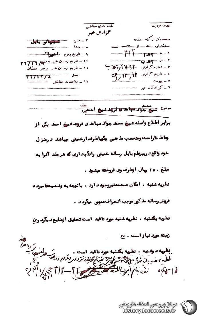 برابر اطلاع واصله شیخ محمدجواد محامدی فرزند شیخ احمد یکی از وعاظ ناراحت و متعصّب مذهبی و گویا طرفدار خمینی میباشد در منزل خود واقع در پیرعلم بابل رساله خمینی را نگهداری که هر جلد آن را به مبلغ 250 ریال از طرف وی فروخته میشود.