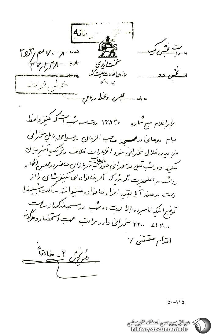 برابر اعلام منبع شماره 13820 مدت سه شب است که یک نفر واعظ به نام روحانی در مسجد صاحبالزمان در سیاهکلا محله1 بابل سخنرانی مینماید در خلال سخنرانی خود اظهارات خلاف و تحریکآمیز بیان میکند و دو شب قبل در سخنرانی خود خطاب به سربازان حاضر در مجلس اظهار داشت به اعلیحضرت بگویید که اگر خانوادهای یک نفرشان را از دست بدهند آیا بقیه افراد خانواده میتوانند ساکت بنشینند؟ توضیح اینکه نامبرده بالا به مدت 10 شب در مسجد مذکور از ساعت 2000 الی 2200 سخنرانی دارد مراتب جهت استحضار و هرگونه اقدام مقتضی.