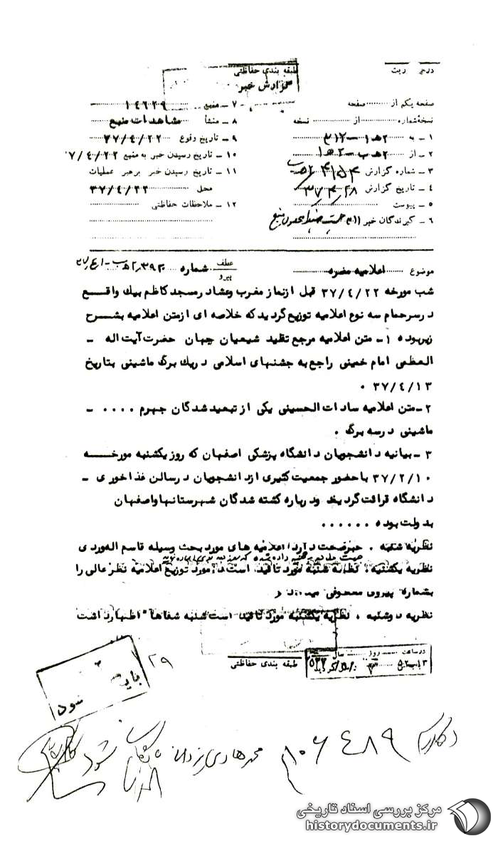 3- بیانیه دانشجویان دانشگاه پزشکی اصفهان که روز یکشنبه مورخه 10 /2 /37 با حضور جمعیت کثیری از دانشجویان در سالن غذاخوری دانشگاه قرائت گردید و درباره کشتهشدگان شهرستانها و اصفهان به دولت بوده [است]...........