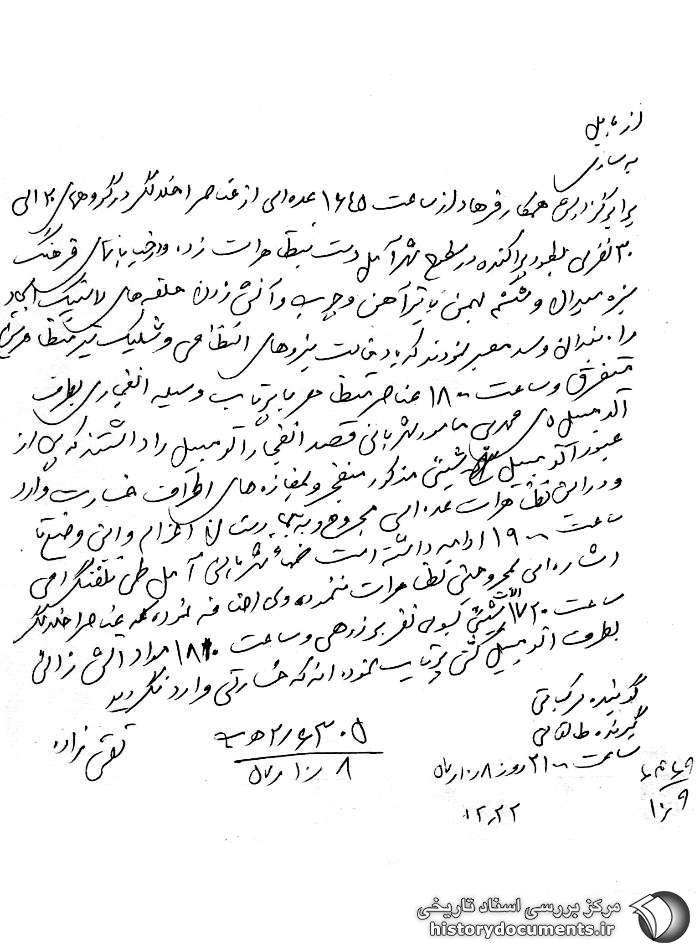 برابر گزارش همکار فرهاد از ساعت 1645 عدهای از عناصر اخلالگر در گروههای 20 الی 30 نفری به طور پراکنده در سطوح شهر آمل دست به تظاهرات زده و در خیابانهای فرهنگ سبزه میدان و ششم بهمن با تیرآهن و چوب و آتش زدن حلقههای لاستیک ایجاد راه بندان و سد معبر نمودند که با دخالت نیروهای انتظامی و شلیک تیر متظاهرین متفرق و ساعت 1800 عناصر متظاهر با پرتاب وسیله انفجاری به طرف اتومبیل آقای محمدی مأمور شهربانی قصد انفجار اتومبیل را داشتند که پس از عبور اتومبیل شیئ مذکور منفجر و به مغازههای اطراف خسارت وارد و در این تظاهرات عدهای مجروح و به بیمارستان اعزام و این وضع تا ساعت 1900 ادامه داشت ضمناً شهربانی آمل طی تلفنگرامی اشارهای به مجروحین تظاهرات ننموده ولی اضافه نموده که عناصر اخلالگر ساعت 1720 شیئ به سوی نفربر زرهی و ساعت 1810 مواد آتشزائی به طرف اتومبیل گشتی پرتاب نمودهاند که خسارتی وارد نگردید.