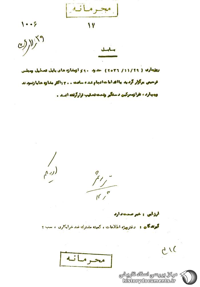 ارزیابی: خبر صحت دارد. گیرندگان: دفتر ویژه اطلاعات، کمیته مشترک ضدخرابکاری، سب 2