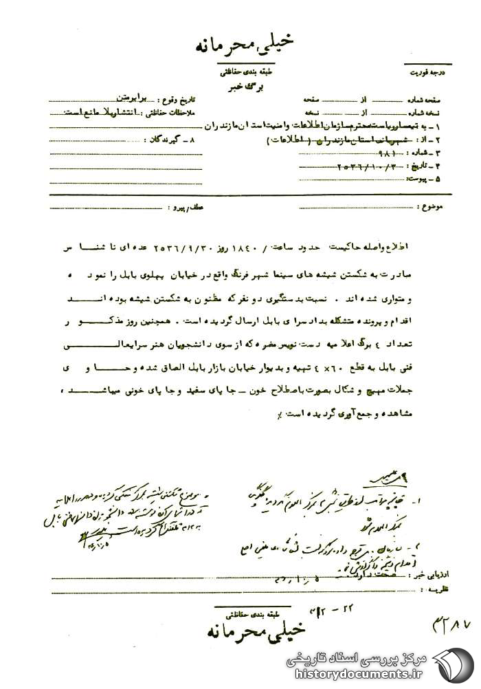 اطلاع واصله حاکی است حدود ساعت 18:40 روز 30 /9 /2536 عدّهای ناشناس مبادرت به شکستن شیشههای سینما شهر فرنگ1 واقع در خیابان پهلوی بابل را نموده و متواری شدهاند. نسبت به دستگیری دو نفر که مظنون به شکستن شیشه بودهاند اقدام و پرونده متشکله به دادسرای بابل ارسال گردیده است. همچنین روز مذکور تعداد 4 برگ اعلامیه دست نویس مضرّه که از سوی دانشجویان هنرسرای عالی فنی بابل به قطع 60 ×4 تهیه و به دیوار خیابان بازار بابل الصاق شده و حاوی جملات مهیج و اشکال به صورت به اصطلاح خون- جا پای سفید وجا پای خونی میباشد. مشاهده و جمع آوری گردیده است.