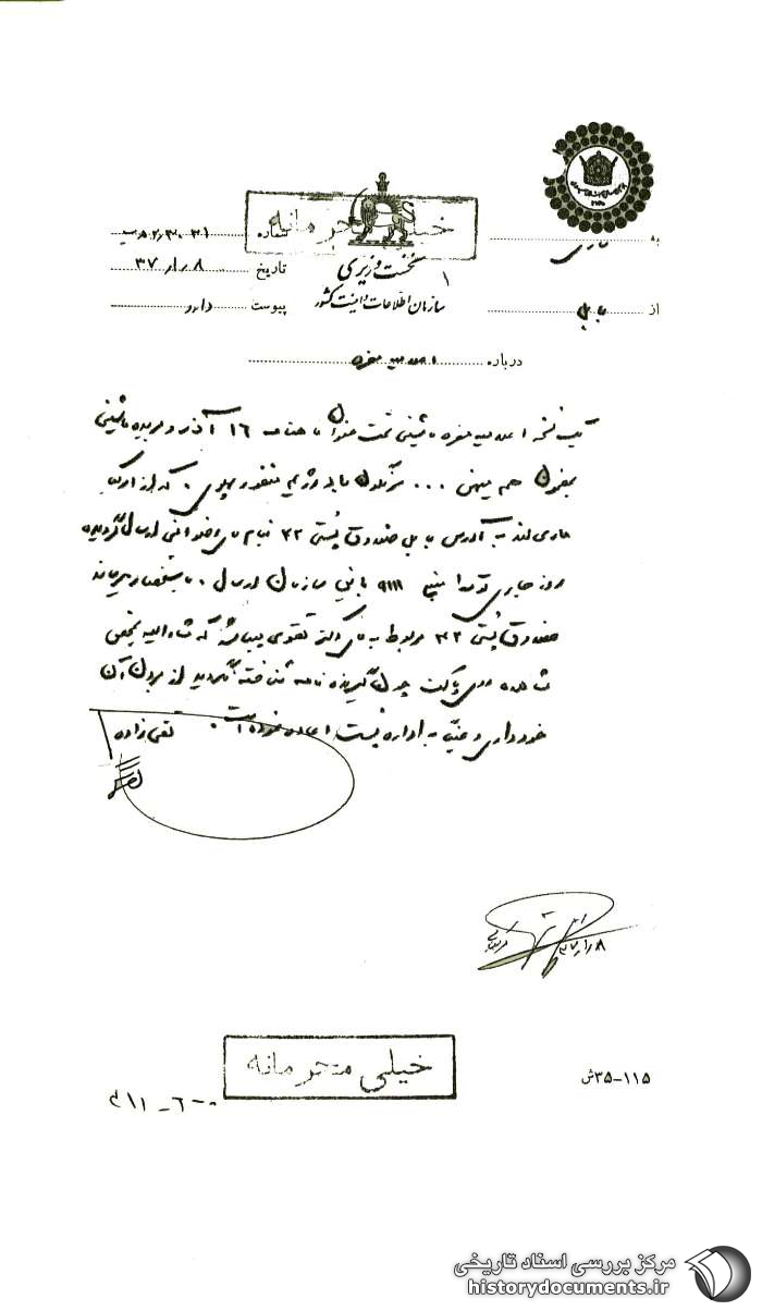 یک نسخه اعلامیه مضرّه ماشینی تحت عنوان ماهنامه 16 آذر و بریده ماشینی به مضمون هم میهن... سرنگون باد رژیم منفور پهلوی، که از آمریکا مریلند به آدرس بابل صندوق پستی 42 به نام آقای رضوانی ارسال گردید روز جاری توسط منبع 9111 به این سازمان ارسال به استحضار میرساند صندوق پستی 42 مربوط به آقای دکتر تقوی میباشد که مشارالیه به محض مشاهده روی پاکت چون گیرنده نامه شناخته نگردید از بردن آن خودداری و عیناً به اداره پست اعاده نموده است. تقیزاده