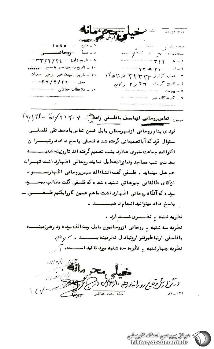 3. اداره کل سوم پس از دریافت این گزارش طی نامه شماره: 4596 / 312 - 26 / 4/ 37 به ساواک مازندران نوشت: «برابر اطلاع واصله در تاریخ 24 /2 /37 نامبرده بالا از بابل با محمدتقی فلسفی در تهران تماس و در مورد اقدامات روحانیون درباره واقعه 19 و 20 قم سئوال کرده که فلسفی پاسخ داده در تهران روحانیون به مدت 5 شب مساجد و نماز را تعطیل کردهاند. با توجه به این که نامبرده در هر زمینه با فلسفی ارتباط برقرار کرده و تبادلنظر مینماید، خواهشمند است دستور فرمائید پیرامون نحوه افکار و عقاید و ارتباط وی به نفع گروههای برانداز مذهبی با استفاده از منابع و همکاران تحقیقات کافی معمول و نتیجه را با تعیین مشخصات کامل ملصق به عکس و هرگونه سوابقی که از وی در آن سازمان موجود است به این اداره کل ارسال نمایند.»