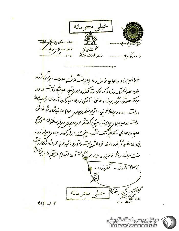 برابر اطلاع واصله عوامل مخالف و ماجراجو شب گذشته مبادرت به نوشتن شعار مضرّه به مضمون مرگ بر شاه که حکومتکننده اسرائیل جنایتکار است، درود بر دکتر مصدق، مرگ بر شاه خائن، آتش زدن سینما رکس آبادان1 به وسیله عمال دولت، درود بر امام خمینی، رژیم منفور پهلوی، مردم بدانید شاه شما خائن است. در خیابانهای چهارشنبهپیش کفشگرمحله روبروی دیوار ساختمان مسجد شیخ علیجان صالحی – کوچه ملک تنگه – پنجشنبهبازار کهنه به روی دیوار زرد ساختمان مفیدیان نمودهاند. خواهشمند است دستور فرمائید ضمن محو شعارهای مورد بحث نسبت به شناسائی نویسنده یا نویسندگان آن اقدام و نتیجه را به این سازمان اعلام دارند.