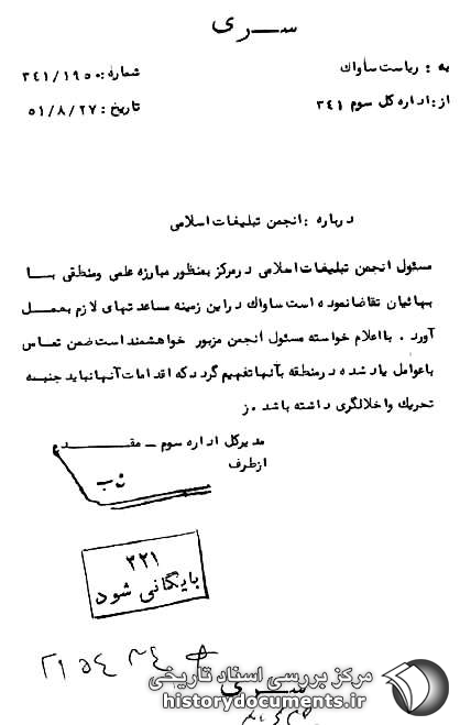 مسئول انجمن تبلیغات اسلامی [انجمن حجتیه] مرکز به منظور مبارزه علمی و منطقی با بهائیان تقاضا نموده است ساواک در این زمینه مساعدتهای لازم به عمل آورد. با اعلام خواسته مسئول انجمن مزبور خواهشمند است ضمن تماس با عوامل یادشده در منطقه به آنها تفهیم گردد که اقدامات آنها نباید جنبه تحریک و اخلالگری داشته باشد.