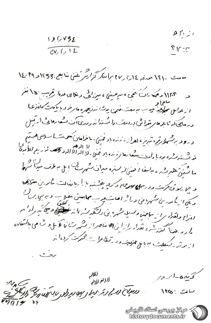ساعت 1210 مورخه 14 /2 /37 بر اساس گزارش تلفنی منابع 12660 و 14039 و 11203 و همکاران گنجی، میرحسینی، میرزائی و غلامی عدّهای قریب 150 نفر از عوامل ماجراجو چوب به دست ضمن پوشاندن چهرههای خود با پاکات کاغذی در حالی که تابلوهای مقوائی در دست داشتهاند و روی آن شعارهائی از قبیل درود بر شهدای قم، تبریز، اهواز [و] زنده باد خمینی [و] ما خواهان حکومت اسلامی هستیم نوشته شده بود با دادن شعارهای زنده باد خمینی [و] لا اله الا الله و توزیع اعلامیههای ماشینی تکثیر شده به امضاء خمینی از سبزهمیدان شهرستان بابل به طرف میدان شهداء و چهارسوق حرکت و در محل سر حمام و کوچه پنجشنبهبازار با دخالت مأمورین متواری و یکی از مأمورین شهربانی در اثر اصابت چوب مهاجمین مضروب و به بیمارستان اعزام و تعدادی از مهاجمین وسیله شهربانی دستگیر شدهاند تحقیق و پیگیری ادامه دارد. ضمناً گفته شده تعدادی از این عناصر از شهرستانهای آمل و شاهی با استفاده از موتورسیکلت به بابل عزیمت و در تظاهرات شرکت کردهاند.