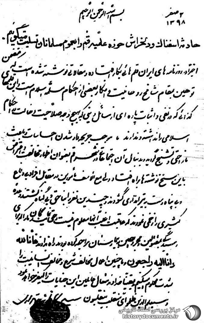 حادثه اسفناک و دلخراش حوزه علمیه قم را به عموم مسلمانان تسلیت میگوییم. اخیراً در روزنامههای ایران قلمهایی به کار افتاده و مقالاتی نوشته شده است که متضمن توهین به مقام شامخ روحانیت و افکار بعضی از احکام مسلمه اسلام است و این قلمهای کذائی که در نفی و اثبات پارهای از مسائل دینی که به هیچ وجه صلاحیت دخالت در احکام اسلامی را نداشته و ندارند، موجب جریحهدار شدن احساسات و باعث ناراحتی و تشنج گردید و به دنبال آن اجتماعاتی در شهرهای قم به عنوان اظهار مخالفت و اعتراض به این سنخ نوشتهها به راه افتاد ولى معالاسف مأمورین در مقابل افراد بیدفاع و بیپناه دست به تیراندازی گشودند و چندین نفر را به ناحق و بیگناه کشتند و عدهی کثیری را زخمی نمودند که عاقبت اغلب آنها معلوم نیست و حتی نمایندگان را که برای رسیدگی به مقتولین و مجروحین به بیمارستان مراجعه کرده بودند راه ندادند فانالله وانا الیه راجعون و ما چنین اعمال مخالف شرع و مخالف انسانیت را به شدت محکوم میکنیم و یقیناً خداوند متعال عاملین این جنایت را کیفر خواهد نمود. و سیعلم الذین ظلمو ای منقلب ینقلبون