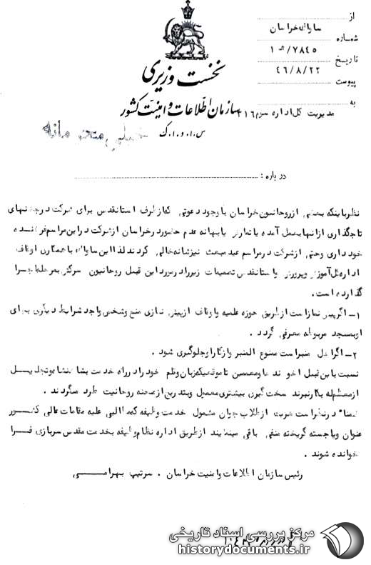 نظر به اینکه بعضی از روحانیون خراسان با وجود دعوتی که از طرف آستان قدس برای شرکت در جشنهای تاجگذاری از آنها به عمل آمده با تمارض یا بهانه عدم حضور در خراسان از شرکت در این مراسم فرخنده خودداری و حتی از شرکت در مراسم عید مبعث نیز شانه خالی کردند، لذا این ساواک با همکاری اوقاف، اداره آموزش و پرورش و آستان قدس تصمیمات زیر را در مورد این قبیل روحانیون سرکش به مرحله اجرا گذارده است: