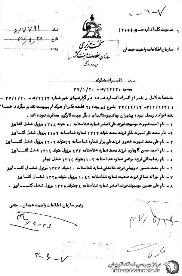 مشخصات کامل ۸ نفر از افراد اشاره شده در گزارشهای خبر شماره 6223/ ه- 20 /1 /37 و 9231 /312- 16 /12 /36 بشرح زیر بوده و دو قطعه عکس از هر کدام به پیوست تقدیم میگردد ضمناً بقیه افراد در محل نبوده و به تهران و یا شهرستانهای دیگر جهت کارگری مسافرت نمودهاند.