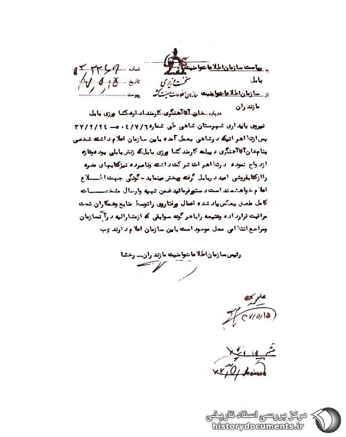 نیروی پایداری شهرستان شاهی طیّ شماره 6 /7 /504 ـ 24 /2 /37 پس از تظاهراتی که در شاهی به عمل آمده به این سازمان اعلام داشت شخصی به نام خانآقا آهنگری دیپلمه کارمند کشاورزی بابل که زنش بابلی بوده و تازه ازدواج نموده در تظاهرات شرکت داشته و نامبرده نیز کتابهای مضرّه را از کتابفروشی امید در بابل گرفته و پخش مینماید چگونگی جهت اطلاع اعلام خواهشمند است دستور فرمائید ضمن تهیه و ارسال مشخصات کامل ملصق به عکس یادشده اعمال و رفتار وی را توسط منابع و همکاران تحت مراقبت قرار داده و نتیجه را با هرگونه سوابقی که از مشارالیه در آن سازمان و مراجع انتظامی محل موجود است به این سازمان اعلام دارند.ب
