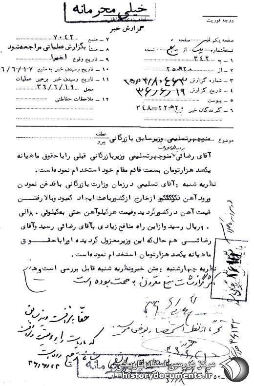 حقّا به شرافت وزیر سابق که مادیات را بر موقعیت و شرافت انسانی ترجیح داده است.[دستخط مقدم] 23 /6 /36