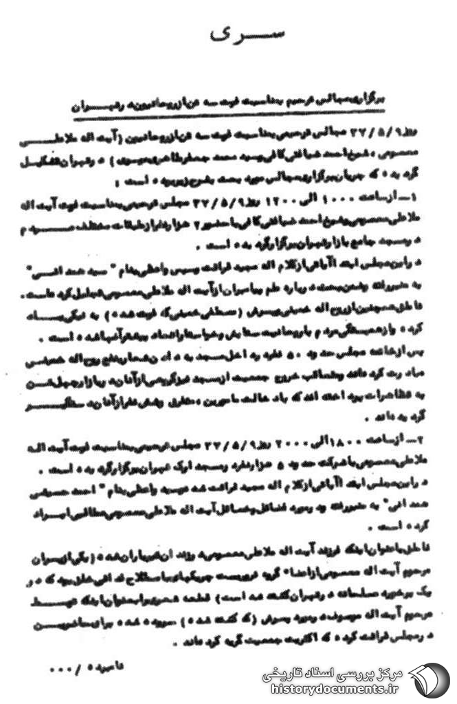 1- از ساعت ۱۰۰۰ الى ۱۲۰۰ روز 9 /5 /37 مجلس ترحیمی به مناسبت فوت آیتاله ملاعلی معصومی و شیخ احمد ضیافتیکافی با حضور ۲ هزار نفر از طبقات مختلف مردم در مسجد جامع بازار تهران برگزار گردیده است. در این مجلس ابتدا آیاتی از کلام اله مجید قرائت و سپس واعظی بنام «سید همدانی» به منبر رفته و ضمن بحث درباره علم پیامبران از آیتاله ملاعلی معصومی تجلیل کرده است. ناطق همچنین از روحالله خمینی و پسرش (مصطفی خمینی که فوت شده) به نیکی یاد کرده و از همبستگی مردم با روحانیت ستایش و خواستار اتحاد بیشتر آنها شده است.