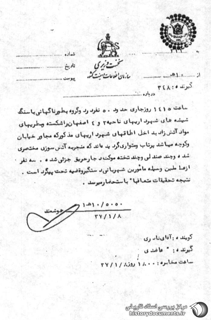 «بعد از ظهر روز سه شنبه (8 /1 /57) سرنشینان یک اتومبیل سواری با شکستن شیشههای شعبه بانک صادرات در خیابان باغشاه اصفهان مقداری اعلامیۀ ضد میهنی و تحریکآمیز به داخل بانک ریختند.» (همان منبع)
