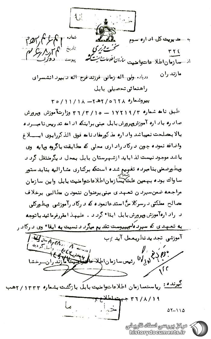 طبق نامه شماره 3 /17219- 15 /3 /36 وزارت آموزش و پرورش صادره به اداره آموزش و پرورش بابل مبنی بر اینکه ادامه تدریس نامبرده بالا به مصلحت نمیباشد و اداره مذکور مفاد نامه فوقالذکر را به وی ابلاغ و اضافه نموده چون در کادر اداری محلّی که مطابقت با گروه و پایه وی باشد موجود نیست لذا باید از شهرستان بابل به محل دیگر منتقل گردد و به طور ضمنی به نامبرده تفهیم شده است که برکناری مشارالیه بنا به دستور ساواک بوده به همین علّت مشارالیه به سازمان اطلاعات و امنیت بابل و این سازمان مراجعه ضمن سپردن تعهدی مبنی بر عنوان نمودن مطالبی برخلاف مصالح مملکتی در سر کلاس استدعا نموده که در کادر آموزشی و بطور کلّی در اداره آموزش و پرورش بابل ابقاء گردد. علیهذا مقرر فرمائید باتوجه به تعهدی که سپرده که به پیوست تقدیم میگردد نسبت به ابقاء وی در کادر آموزشی تجدیدنظر به عمل آید.2
