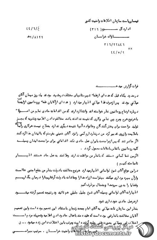 به نظر این سازمان نامه میلانی به آقای امامجمعه زنجان به استناد این تصمیم بوده است و این تصمیم آقایان مخالفت با نظر قمی بوده است که عقیدهمند به اعمال حاد و دادن اعلامیه و تحریک مردم است. اختلاف قمی و میلانی بهصورت علنی جلوهگر شده است و مرتب به این اختلاف دامن زده میشود. رئیس سازمان اطلاعات و امنیت خراسان ـ سرتیپ بهرامی