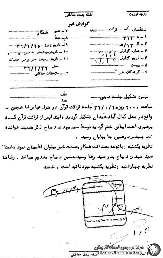 ساعت ۲ روز 2 /1 /36 جلسه قرائت قرآن در منزل عباس شاهجین1 واقع در محل کمالآباد همدان تشکیل گردید، ابتد اپس از قرائت قرآن که به رهبری احمد ایمانی ختم گردید توسط سید مهدی دیباج ذکر مصیبت خوانده شد و مجلس در همین جا به پایان رسید.