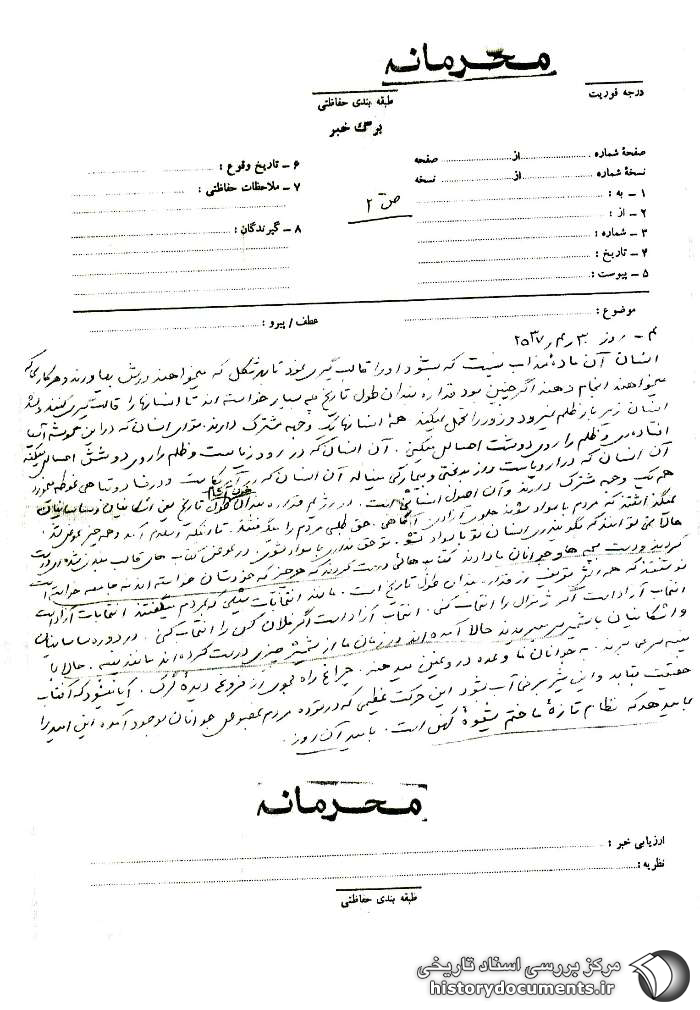 2-روز 28 /4 /37: نفت ما را یکی میبرد، گازمان را یکی دیگر، یکی از شرق توی سرمان میزند و یکی از غرب توی سرمان میزند، باید به مقاومت ادامه داد تا پیروز شد. باید گلوی باطل را گرفت تا کار تمام شود. نباید در بین این درگیریها فاصله انداخت. در جامعه ما همیشه دو نیروی متضاد با هم درگیری دارند. یکی حقانیت است که نیرویش اندک اما محتوا دارد و دیگری نیروی باطل که نیرویش زیاد اما محتوا ندارد. نیروی حقانیت برای نابودی دشمنان اسلام و از بین بردن فساد حتی از ریختن خون خود اباء ندارد، نیروی باطل سعی میکند به هر نحوی شده همه چیز را برای منافع خودش نابود کند. بالاخره حق بر باطل پیروز میشود. سلام بر کسانی که آزاد زندگی کردند و آزاد مردند تا به آنهائی که بردهوار زندگی میکنند و بردهوار هم میمیرند درس انسانیت بدهند، پروردگارا نیروهای اهریمنی این جامعه را نابود کن. 3- 29 / 4 / 37: