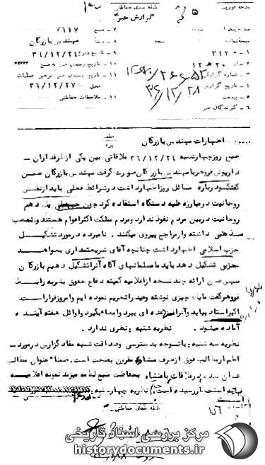 صبح روز چهارشنبه 24 /12 /36 ملاقاتی بین یکی از طرفداران داریوش فروهر با مهندس بازرگان صورت گرفت. مهندس بازرگان ضمن گفتگو درباره مسایل روز اظهار داشت: در شرایط فعلی باید از نقش روحانیت در مبارزه علیه دستگاه استفاده کرد، چون جبهه ملی یک دهم روحانیت در بین مردم نفوذ ندارد و مردم مملکت اکثراً عوام هستند و تعصب مذهبی داشته و از مراجع پیروی میکنند. نامبرده در مورد تشکیل حزب اسلامی اظهار داشت: چنانچه آقای شریعتمداری بخواهد حزبی تشکیل دهد، باید ما مسلمانهای آگاه آن را تشکیل دهیم. بازرگان سپس ضمن ارائه چند نسخه از اعلامیه کمیته دفاع حقوق بشر به رابط فروهر گفت: ما یک چیزی نوشته و عید را تحریم نمودهایم و امروز قرار است اکبر استاد بیاید و آن را نزد عدهای ببرد و امضا بگیرد و اوایل هفته آینده آماده میشود.