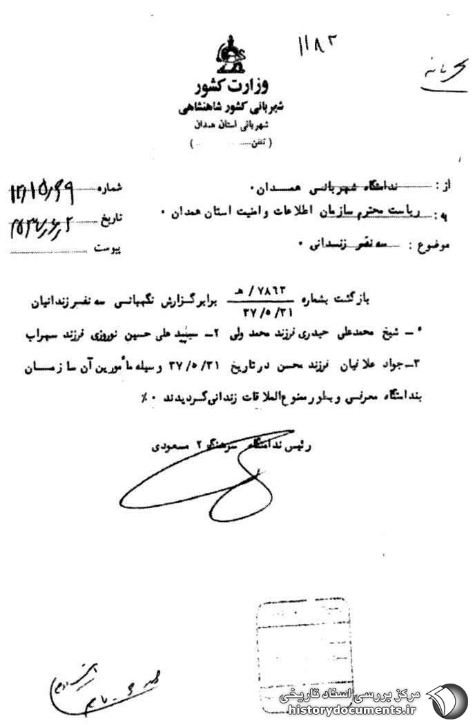 بازگشت به شماره 7863 ه /31 /5 /37 برابر گزارش نگهبانی سه نفر زندانیان ۱- شیخ محمدعلی حیدری فرزند محمدولی ۲- سید علی حسین نوروزی فرزند سهراب ۳- جواد علافیان فرزند محسن در تاریخ 31 /5 /37 به وسیله مأمورین آن سازمان به ندامتگاه معرفی و به طور ممنوعالملاقات زندانی گردیدند.