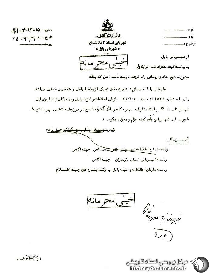مقام عالی را آگاه میسازم، نامبرده فوق که یکی از وعاظ افراطی و متعصّبین مذهبی میباشد برابر نامه شماره 4541 / 2ﻫ ب – 2 /6 /37 سازمان اطلاعات و امنیت بابل وسیله یگان ژاندارمری این شهرستان دستگیر و اینک مشارالیه به همراه کلیه وسائل مکشوفه مندرج در صورتجلسه تنظیمی پیوست1 توسط مأمورین این شهربانی به آن کمیته اعزام و معرفی میگردد.