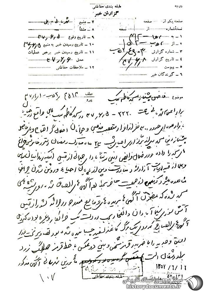 برابر اعلام شهربانی ساعت 2220 – 5 / 6 /37 در مسجد کاظمبیک بابل واقع در خیابان بازار عدهای حدود 300 نفر از افراد متعصب مذهبی و جوانان اخلالگر اجتماع و آقای فاضل پیشنماز این مسجد پس از برگزاری احیای شب 23 ماه مبارک رمضان دستور خاموشی چراغهای مسجد را داده و در خلال فرایض دینی مرتباً به ادای جملاتی از قبیل اینکه زندانیان سیاسی و علما از قید اسارت آزاد شوند مبادرت و پس از پایان احیاء و روشن شدن چراغها مشاهده میشود که نیمی از جمعیت حاضر به مطالعه آگهیهای الصاق شده روی شیشههای مسجد شده که مضمون آگهیها بریدههای وقایع مندرجه در جرائد کشور از قبیل آتشسوزی سینما آبادان و انفجار بمب در دست یک خرابکار و غیره بوده که ذیل آگهیهای الصاقی که روی یک برگ سفید چسبانیده شده بود، تصاویر نخستوزیر اسبق و جدید را با ضربدر قرمز مشخص و بین دو عکس با خط قرمز جمله (سگ زرد برادر شغال است) منعکس گردیده بود که وسیله مأمورین شهربانی آگهی مذکور کنده و ضبط گردیده [است].