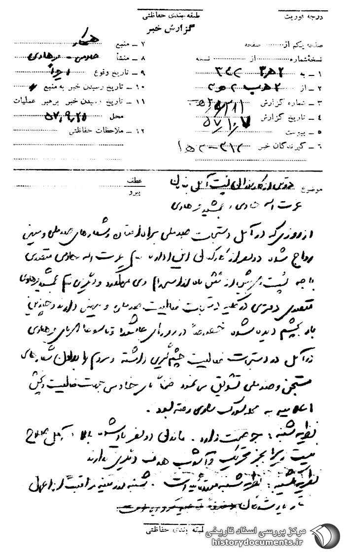 از روزی که در آمل دستجات ضد ملی به راه افتاده و شعارهای ضد ملی و میهنی رواج شده دو نفر از کارکنان این اداره به نام عزتاله خادمی متصدی باجه پست که بیش از شش ماه از استخدام وی نمیگذرد و دیگری به نام جمشید فرهادی متصدی دفتری در کلیه دستجات فعالیت ضد ملی و میهنی دارند و چندین بار به چشم دیده شده خصوصاً در روزهای عاشورا و تاسوعا آقای فرهادی در آمل در دستجات فعالیت چشمگیری داشته و مردم را به دادن شعارهای مستجن و ضد ملی تشویق مینمود ضمناً آقای خادمی جهت فعالیت و پخش اعلامیه به محله سورک ساری رفته بود.