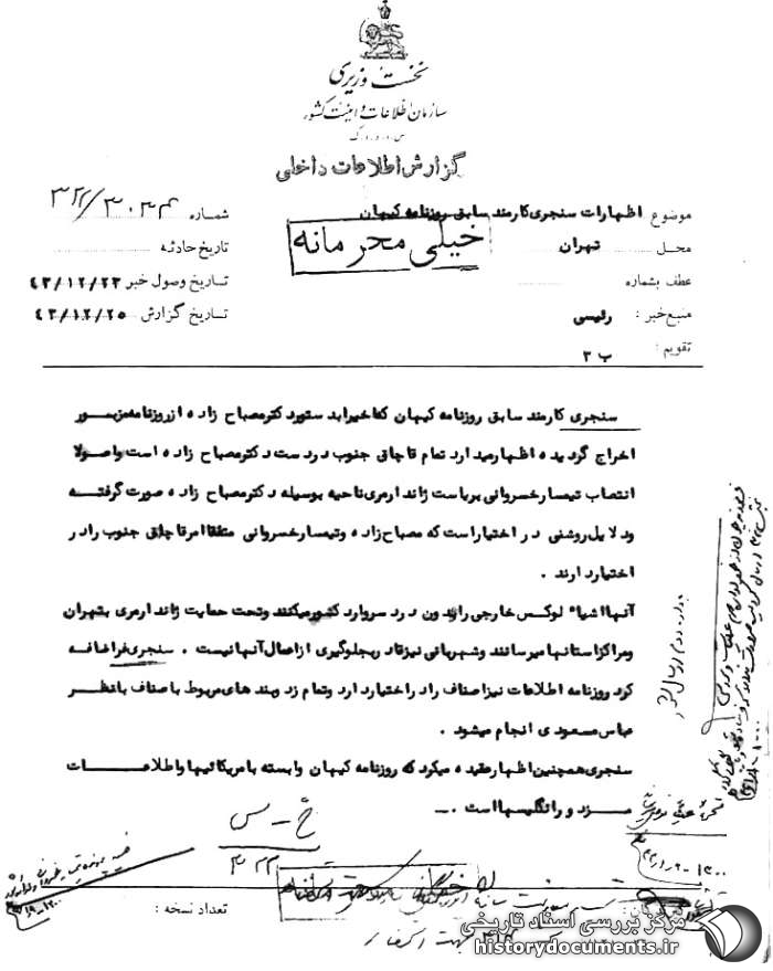سنجری کارمند سابق روزنامه کیهان که اخیراً به دستور دکتر مصباحزاده از روزنامه مزبور اخراج گردیده اظهار میدارد تمام قاچاق جنوب در دست دکتر مصباحزاده است و اصولاً انتصاب تیمسار خسروانی به ریاست ژاندارمری ناحیه به وسیله دکتر مصباحزاده صورت گرفته و دلایل روشنی در اختیار است که مصباحزاده و تیمسار خسروانی متفقاً امر قاچاق جنوب را در اختیار دارند.