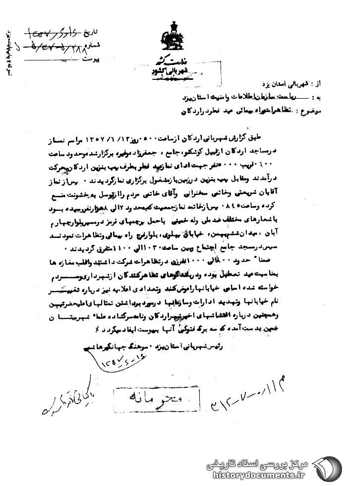 طبق گزارش شهربانی اردکان از ساعت 0500 روز 13 /6 /1357 مراسم نماز در مساجد اردکان از قبیل کوشکنو، جامع، جعفرزاده و غیره برگزار شده و حدود ساعت 0600 قریب 5000 نفر جهت ادای نماز عید فطر به طرف پمپ بنزین اردکان به حرکت درآمدند و مقابل پمپ بنزین در زمین باز مشغول برگزاری نماز گردیدند. پس از نماز آقایان شریعتی و خاتمی سخنرانی و آقای خاتمی مردم را از توسل به خشونت منع کرده و ساعت 0845 پس از خاتمه نماز جمعیت که به حدود 7 الی 8 هزار نفر رسیده بود با شعارهای مختلف ضدملی و له خمینی با حمل پرچمهای قرمز در مسیر بلوار چهارم آبان، میدان ششم بهمن، خیابان پهلوی، بلوار فرح راهپیمائی و تظاهرات نمودند سپس در مسجد جامع اجتماع و بین ساعت 1030 الی 1100 متفرق گردیدند. ضمناً حدود 800 الی 1000 نفر زن در تظاهرات شرکت داشتند و اغلب مغازهها به مناسبت عید تعطیل بوده و در بلندگوهای تظاهرکنندگان از شهرداری و مردم خواسته شده اسامی خیابانها را عوض کنند و تعدادی اعلامیه نیز درباره تغییر نام خیابانها و تهدید ادارات و سازمانها در مورد برداشتن تمثالهای اعلیحضرتین1 و همچنین درباره اغتشاشهای اخیر شهر اردکان2 و نامه سرگشاده علماء شهرستان خمین3 به دست آمده که سه برگ فتوکپی آنها به پیوست ایفاد میگردد. رئیس شهربانی استان یزد . سرهنگ جهانگیر هاشمی بایگانی اقدام شده است.
