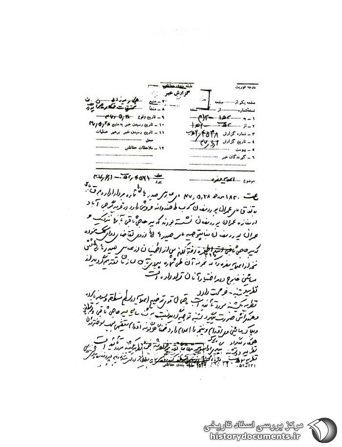 ساعت 1830 مورخه 28 /5 /37 آقای عباس حیدرهائی شمارهبردار اداره برق بابل به اتفاق آقای عمران پوررمضان که بساط هندوانهفروشی دارد در قریه گرجیآباد در مغازه عمران پوررمضان نشسته بودند که پسر حاجی ثاقبی به آنها نزدیک و عمران پوررمضان بنا به توصیه آقای حیدرهائی از وی تقاضای کمک نموده که پسر حاجی ثاقبی ابتدا طفره رفته لکن پس از اطمینان از عباس حیدرهائی شش نسخه از اعلامیه مضرّه را که نمونهی آن طیّ شماره پیروی به آن سازمان تقدیم گردید از ماشین خارج و در اختیار آنان قرار داده است.