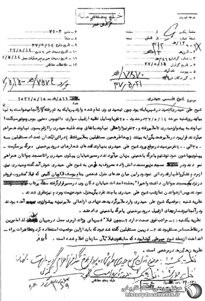 شیخ علی حیدری تبعید در شهر بابک بود چون تبعیدی وی تمام شده و از شهر بابک به قم رفته و از آنجا میخواست به نهاوند بیاید روز شنبه مورخه 14 /5 /37 در حدود ۲۵۰ نفر با وسایل نقلیه از قبیل سواری، اتوبوس، مینیبوس و موتورسیکلت از نهاوند به پیشواز حیدری تا ملایر رفته و ۳۰۰ نفر از اهالی نهاوند به اتفاق چند طلبه حیدری را از قم به سوی نهاوند همراهی میکردند قرار بود در ملایر همدیگر را ببینند (و بخاطر همین مستقبلین به ملایر رفتند) در اثر راه بندان تعداد مستقبلین ۳۵۰ الى 400 نفر میرسید در موقع ورود شیخ علی حیدری به نهاوند عدهای شعارهای درود بر خمینی، مرگ بر حکومت پهلوی و با خون خود نوشتیم یا مرگ یا خمینی به زبان میآوردند در مسیر خیابان پهلوی حیدری را تا مسجد جوانان همراهی نمودند و در مسجد مزبور محمد دانشزاده معروف به مومن به شیخ علی حیدری خوش آمد گفت و حیدری نیز از مردم تشکر و اظهار قدردانی نمود در این میان عدهای منزل شخصی به نام یوسف (اویان کلیمی) که قبلاً مشروب فروشی در نزدیک مسجد جوانان داشت و اخیراً به علت احداث خیابان دکان وی در مسیر قرار گرفته پرتاب نمودند و پس از خواندن نماز شب شیخ على حیدری با چند نفر دیگر به منزل خود عزیمت و مردم نیز متفرق شدند.