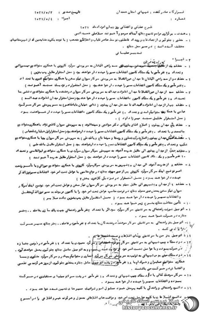 ۱۳- دو دستگاه جیپ شهربانی به سرنشینی سرکار سرگرد احتشامی و سردگرد معبودی با تعداد ۱۲ نفر مأمور در طرفین جنازه در حرکت بوده و با عوامل تحت امر خود از نزدیک شدن مردم و به اتومبیل حامل جنازه جلوگیری به عمل خواهند آورد.