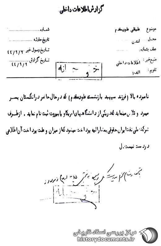 نامبرده بالا (فرزند سپهبد بازنشسته علویمقدم) که در حال حاضر در انگلستان بسر میبرد و تلاش مینماید که در یکی از دانشگاههای امریکا و یا بیروت ثبت نام نماید. از طرف شرکت ملی نفت ایران حقوقی به مشارالیه پرداخت میشود که از میزان و علت پرداخت آن اطلاعی در دست نیست.