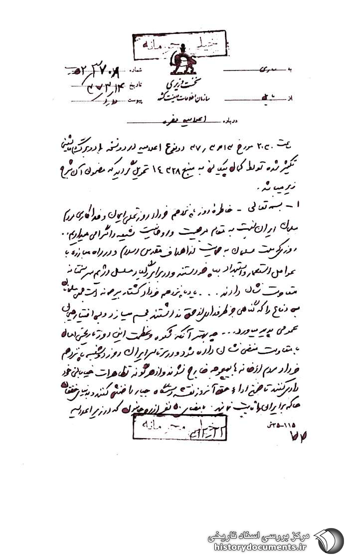 ساعت 2030 مورخ 13 / 3 /37 دو نوع اعلامیه در دو نسخه (دو برگ) ماشینی تکثیر شده توسط کمال پیکانی به منبع 14328 تحویل گردید که مضمون آن به شرح زیر میباشد: