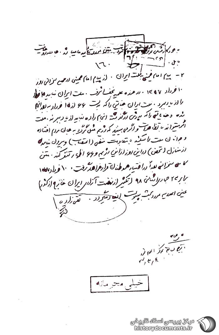 2-پیام امام خمینی به ملّت ایران. از پیام امام خمینی در ضمن سخنرانی روز 10 خرداد . در حوزه علمیه نجف اشرف. ملّت ایران نباید 15 خرداد را از یاد ببرد. ملّت ایران جنایتی را که به دست 66 از 15 خرداد به بعد انجام شده و جنایاتی را که پدرش در گذشته آنجام داده نباید از یاد ببرند. ملّت اگر میتواند با تظاهرات و اگر میبیند که رژیم مثل گرگ به جان مردم افتاده و جوانان ملّت را میکشد با مقاومت منفی (اعتصاب) و بیرون نیامدن از منازل (تحصّن) در این روز از این رژیم و 66 اظهار تنفر کند. متن کامل سخنرانی بعداً در اختیار هموطنان قرار خواهد گرفت. 10 خرداد برابر 23 جمادی الثانی 98 (تکثیر از نهضت آزادی ایران خارج از کشور) عین اعلامیه مورد بحث به پیوست3 ایفاد میگردد.
