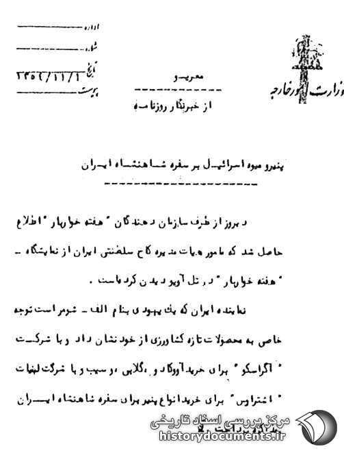 دیروز از طرف سازماندهندگان «هفته خواربار» اطلاع حاصل شد که مأمور هیات مدیره کاخ سلطنتی ایران از نمایشگاه «هفته خواربار» در تلآویو دیدن کرده است.